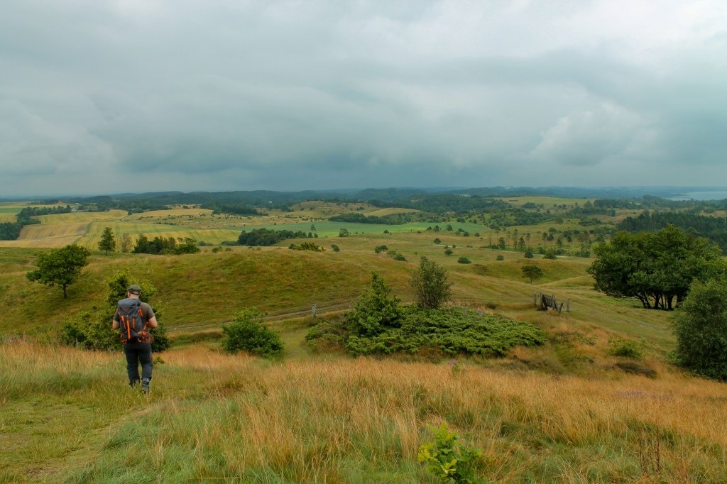 On the way back we take in the rest of our surroundings. Across the curve of the bay we see the low hills of the Mols Bjerge against the sky. Heading into the hills, we move into a landscape long been shaped by human hands. Initially formed during the Ice Age, this moraine landscape was left behind as the ice retreated. Stone Age settlement followed. where graves were dug and chieftains buried. The hills continued to be a sacred site into the Bronze Age, and some of them were not a result of the retreat of the ice at all, but burial mounds to give new shape to the landscape.
