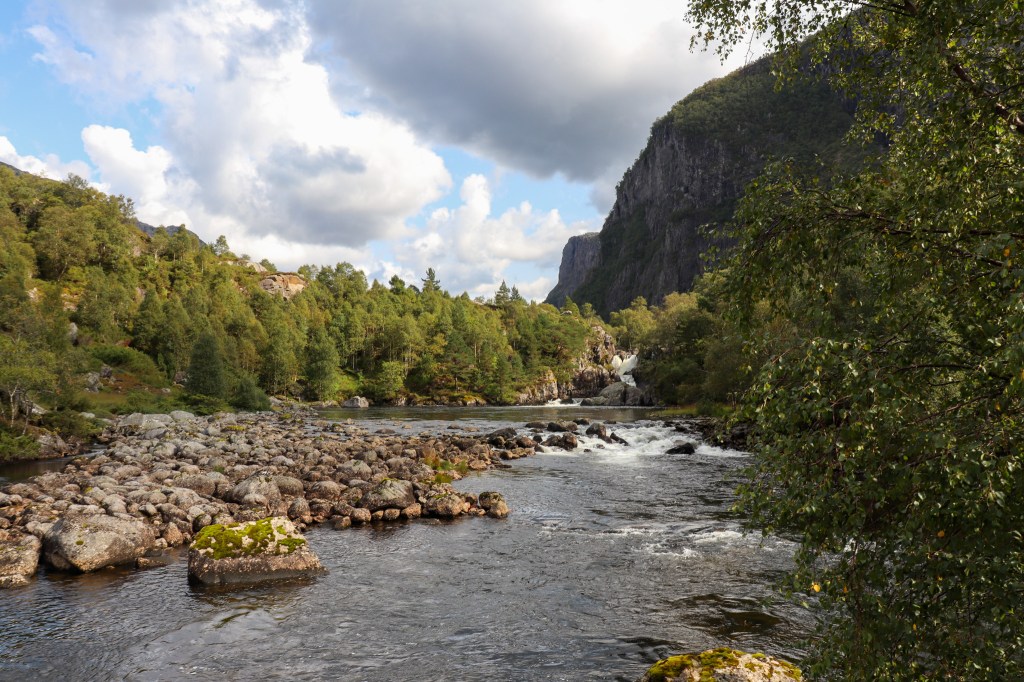 On the steps of the little wooden cabin between the pine trees, we sat with a map and tried to make a plan. We wondered how many of his guests, with their hearts set on the Preikestolen, took his advice and searched out the unheralded spots closer to home. As the sun fell behind the mountains to the west and the quiet of evening only disturbed by the sound of the waterfalls cascading down the hills all around, we decided we would listen to our host. We would stay local. Climb the nearby hills. Explore the nearby valleys.